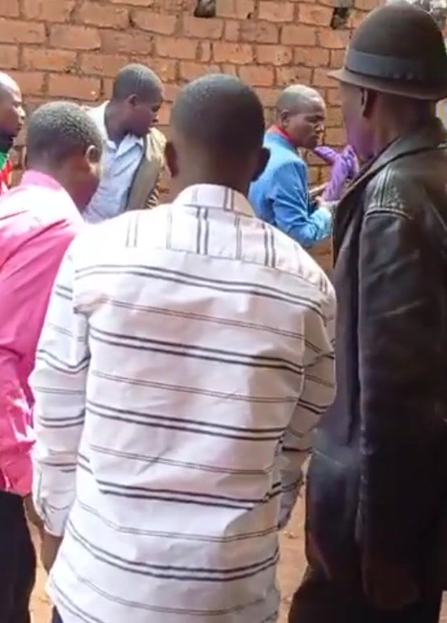 The video depicts a gathering of people in an outdoor space. Many of the individuals are dressed in casual clothing, while some are wearing suits or formal attire. A brick building is visible in the background. The people seem to be congregated under a makeshift canopy or awning. There appear to be varying degrees of engagement or interaction among the people. The overall atmosphere suggests a gathering that could be either formal or informal.