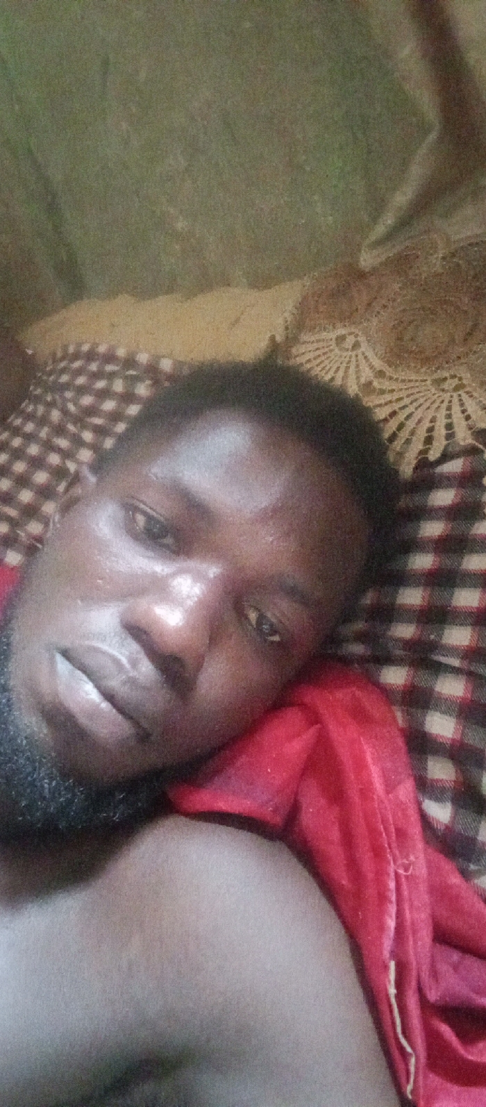 An adult male with dark skin is depicted in a close-up, high-angle photograph, lying in an indoor setting in the city of Unknown, Unknown. He possesses short, dark, curly hair and a full, dark beard. His eyes are open and directed towards the camera, conveying a direct gaze. Highlights are visible on his forehead, nose bridge, and lips, suggesting a localized light source. He is bare-chested on the left side of the frame, with a vibrant red fabric draped over his right shoulder and upper torso. He is resting on a surface covered by a patterned blanket featuring a red, black, and off-white checkered design. The background includes a textured, possibly green wall or curtain on the upper left, while the upper right reveals more of the checkered bedding along with a beige fabric exhibiting a circular, woven or lace-like pattern. The image quality is grainy with a slight greenish tint, indicative of low-light conditions.