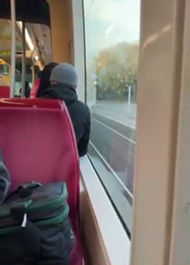The video is shot from inside a tram, focusing on a window view and the seat next to it