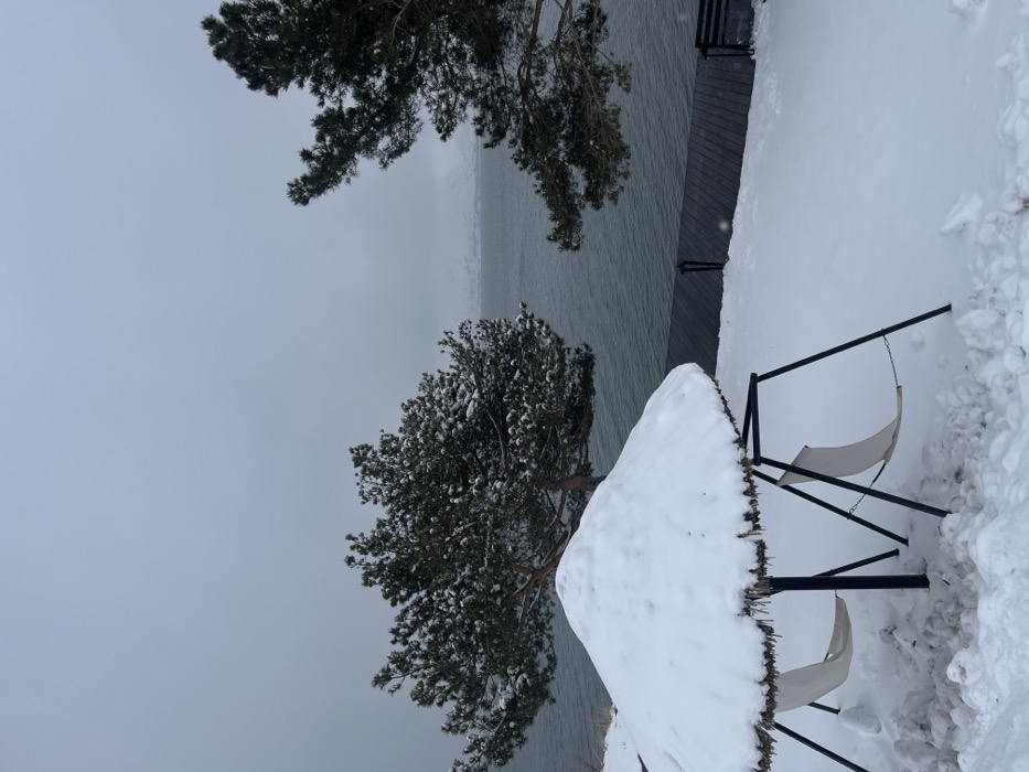 The image depicts a snow-covered outdoor scene adjacent to a large body of water in the city of Tsamakaberd, Armenia, under an overcast sky. In the foreground, occupying the lower left quadrant, is a substantial, conical, thatched umbrella structure heavily laden with snow on its roof. Beneath it, two light-colored fabric sling seats hang from a dark metal frame, also partially covered in snow. The ground surrounding this structure is completely blanketed in white snow. In the midground, beyond the snow-covered ground, a dark wooden deck or pier runs horizontally along the edge of the water, visible from the center right towards the bottom right corner. Two evergreen trees, their branches dusted with snow, are prominent. A larger tree stands to the left, partially behind the umbrella structure, while another tree is visible on the right, framing the view of the water. The background features an expansive, dark blue body of water, likely a lake or large river, which dominates the central and upper-middle portions of the image. Distant, indistinct landforms, possibly snow-covered mountains or hills, are faintly visible across the water under a uniformly gray, overcast sky. No individuals or active interactions are present in the scene. The overall environment suggests cold, winter conditions.
