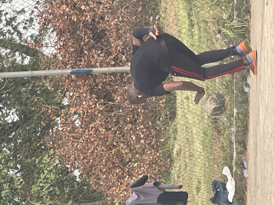 This image depicts an outdoor scene in Okigwe, Nigeria. A Black male adult, with a shaved head, is captured in a bent-over, active posture, seemingly controlling a dark, worn ball on a paved surface. He is wearing a black short-sleeved shirt, black athletic pants with three red stripes running vertically on the sides, and multi-colored athletic shoes (primarily orange and blue). A white wireless earbud is visible in his right ear, a black wristband on his left wrist, and a black compression sleeve covers his left forearm. His right hand is positioned close to the ball. Behind him, a grey metal pole with a blue band is vertically situated. A chain-link fence stretches across the mid-ground; two pieces of clothing, one grey and one black, are draped over it on the left side, with a blue bag resting on the ground near the fence. White plastic debris is scattered along the base of the fence. The background consists of green grass directly behind the fence, followed by dense foliage dominated by brown, dried leaves, with some green trees visible above.