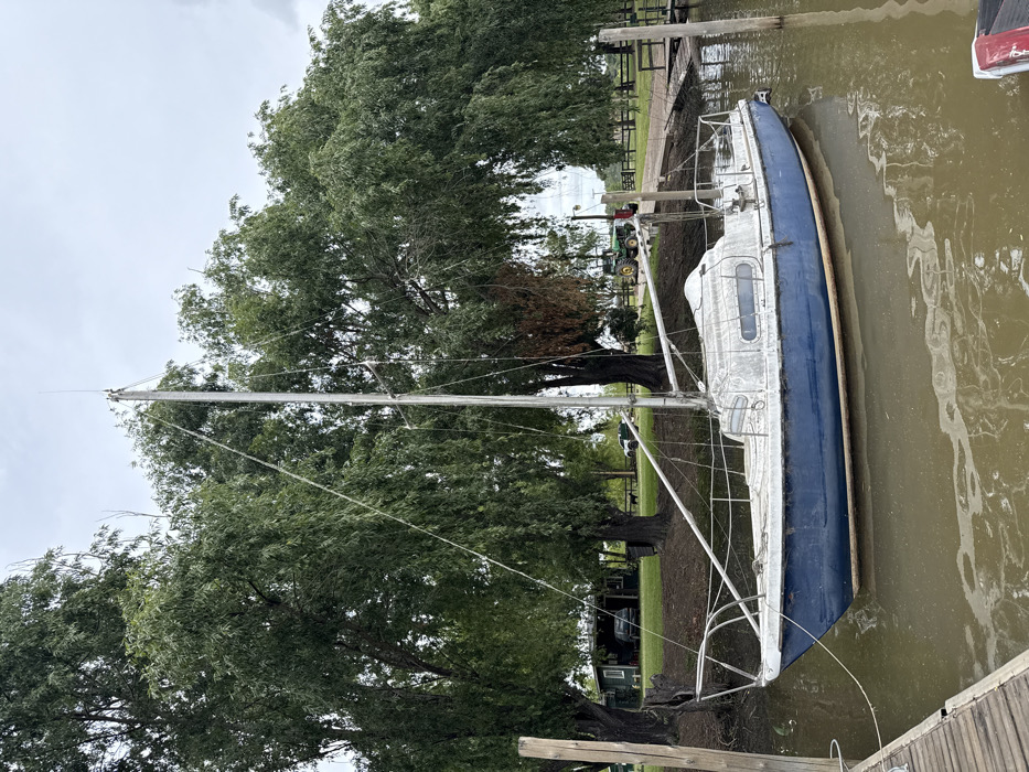 - "A blue-hulled sailboat with a weathered white cabin and a prominent mast is moored to a wooden dock on a muddy waterway in Atucha, Argentina" by FM-x5Zlm1, licensed under CC BY 4.0