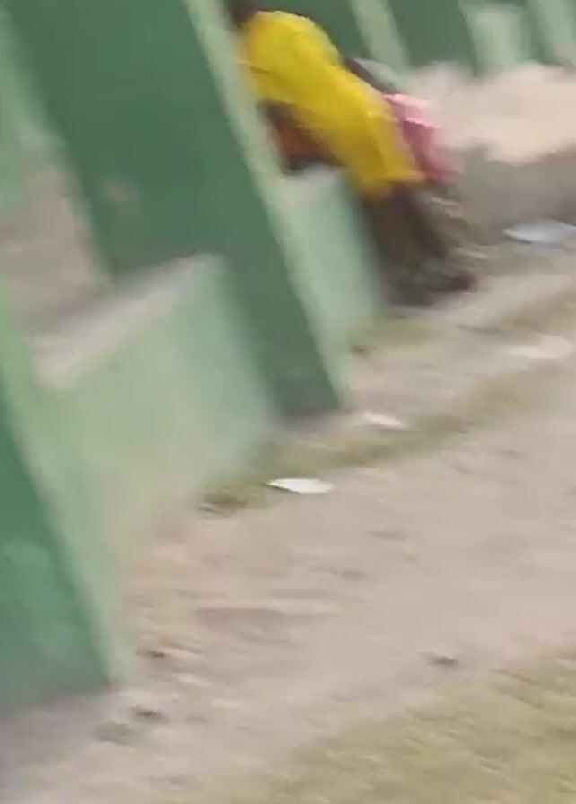 person in a yellow shirt leaning against a green wall with tan trim. A person wearing a gray shirt, jean shorts, and a light blue baseball cap is looking at their phone in front of the same wall. Then the video is shaky and out of focus and shows a person in a white shirt.