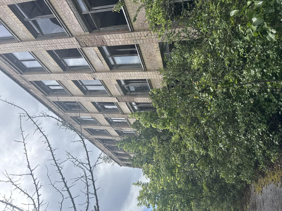 large, abandoned, multi-story brick building with multiple windows. The windows are boarded up and some are broken. The building is located in the city of Pryp'yat', Ukraine at latitude: 51.406, longitude: 30.064. The building is overgrown with foliage. The sky is partly cloudy. No people are visible.