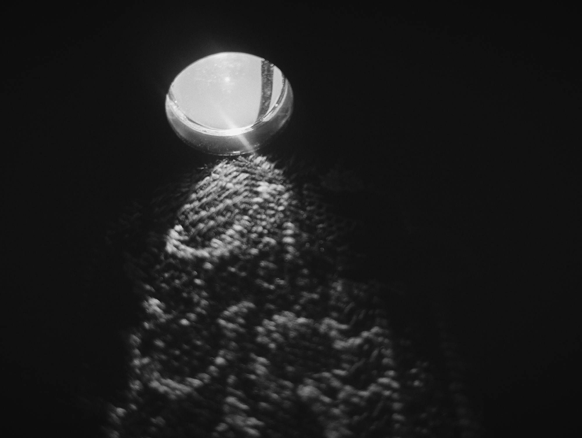 The image, in black and white, depicts a round object that appears to be a magnifying glass or lens refracting light onto a textured surface below