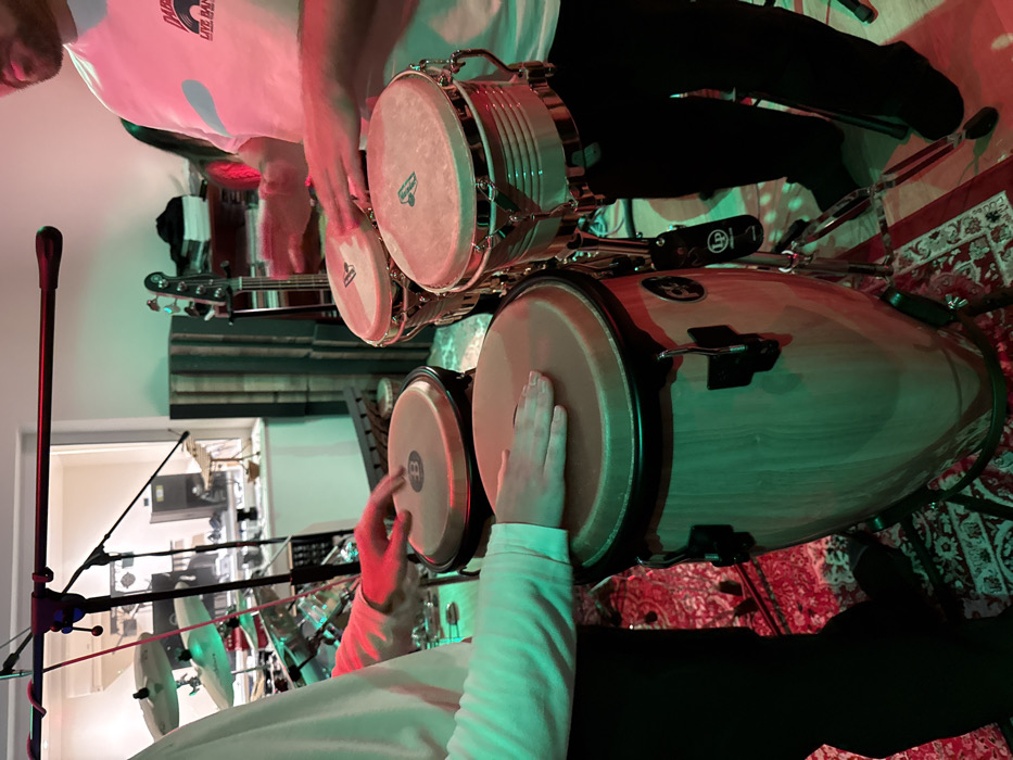 Two individuals are playing conga drums. The foreground features a large, light-colored conga drum with a hand pressing against its surface. Above, a smaller, chrome-finished bongo drum set is visible, with another person's hands poised over its surface. A bass guitar and other musical equipment are partially visible in the background. A microphone stand stands to the left. The overall lighting has a green and red hue.