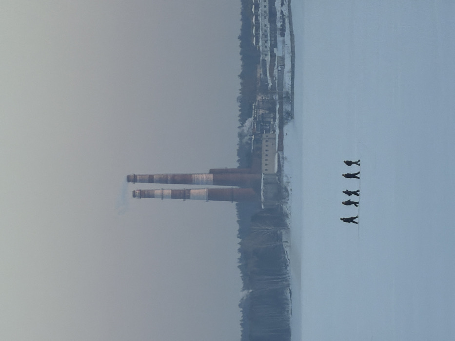 The image depicts a vast, snow-covered, frozen body of water, likely the Kama River or Votkinsk Reservoir, in Chaikovsky, Russia, under an overcast, light grey-blue sky. Five individuals, dressed in dark winter clothing, walk in a single file line from left to right across the expansive, frozen surface in the foreground. On the far bank, the Chaikovsky Thermal Power Plant is visible, characterized by two prominent, tall, cylindrical smokestacks, striped in red and white, with visible exhaust plumes emanating from their tops. Several lower industrial buildings with grey facades and flat roofs are situated around the base of the stacks, some also exhibiting minor emissions. A dense line of snow-dusted evergreen and bare deciduous trees forms a backdrop behind the industrial complex.