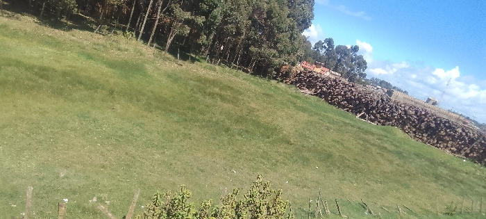 The image displays an outdoor scene in Flyover, Kenya, captured from an elevated and slightly tilted perspective. The foreground is dominated by a expansive, undulating slope of green grass with sporadic lighter patches and some low-lying green foliage at the bottom. A rudimentary fence made of slender wooden stakes is partially visible in the lower right. Along the upper left portion of the slope, a dense line of tall, slender trees with dark green foliage forms a natural boundary. To the right, on a higher elevation, a substantial, elongated stack of dark brown, cut logs is horizontally piled, extending across the midground for a significant distance. Above this woodpile, several buildings with orange-brown roofs are visible, and a tall, slender mast or communication tower stands against the sky on the far right. The background features a clear blue sky interspersed with scattered white clouds. No persons are present or engaged in any discernible actions.
