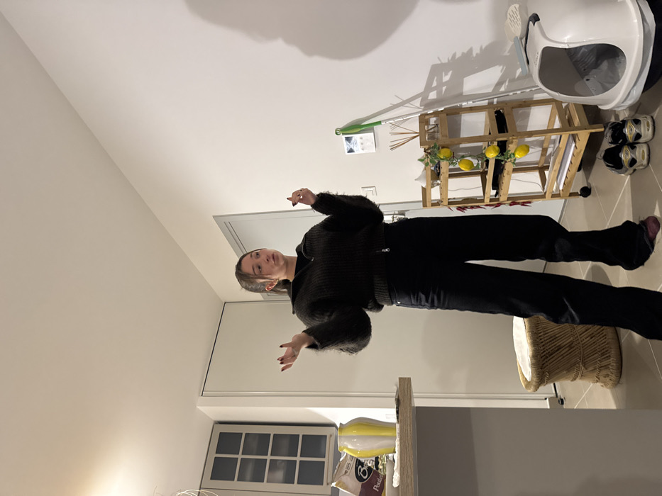 A woman stands indoors wearing a dark jacket and black pants. Behind her is a white door and a cabinet with glass doors. To her right is a wooden shelf with lemons, a white cat litter box, and a pair of shoes. A woven stool is visible further to her right. The photo appears to be taken from a low angle, looking up at the woman.