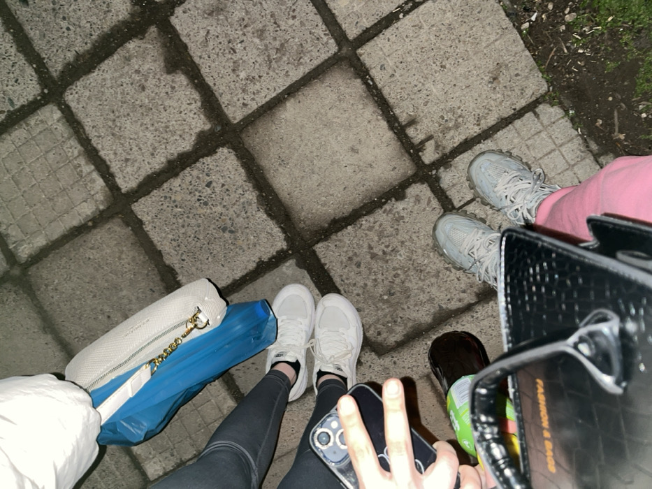 The image presents an overhead view of a paved ground surface in Vratsa, Bulgaria, showing the lower extremities of three individuals and their personal belongings