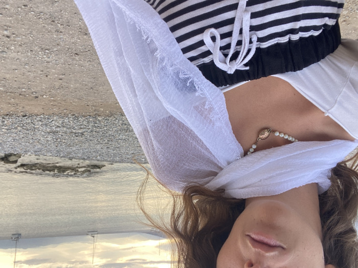 The image displays a partial portrait of a female subject, encompassing the torso and lower facial features, positioned on the left side of the frame. The subject has visible wavy brown hair and is wearing a white V-neck garment, a white, sheer fabric scarf draped around the neck and shoulders, and black and white horizontally striped shorts or pants with a white drawstring waistband. A pearl necklace, featuring a central ornate gold-toned clasp, is worn around the neck. The background reveals a pebbled and sandy shoreline adjacent to a body of water. Three distinct sailboats are present on the water, with distant landmasses visible on the horizon. The atmospheric lighting suggests either dawn or dusk. The scene is located in an unknown coastal region of Greece.