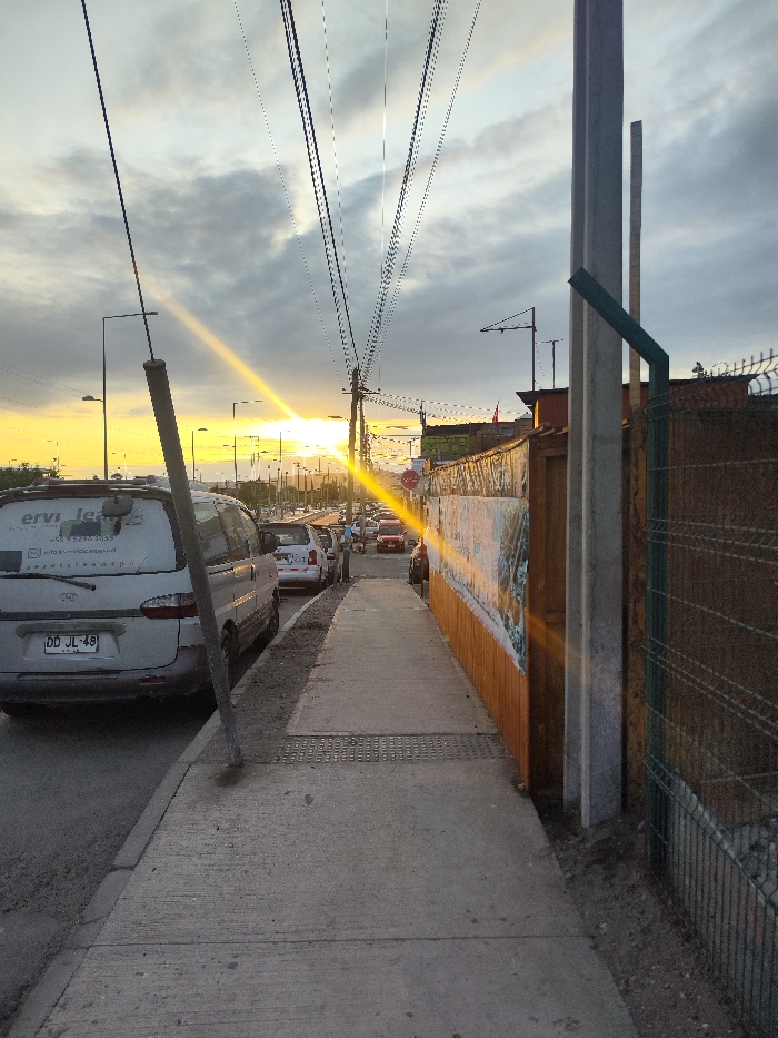 A sidewalk runs alongside a street filled with cars. A parked van obscures part of the sidewalk. A fence and building line the right side of the walkway, while power lines stretch overhead, converging towards the setting sun. The sky is filled with clouds, and the sunlight creates bright glare spots within the scene.
