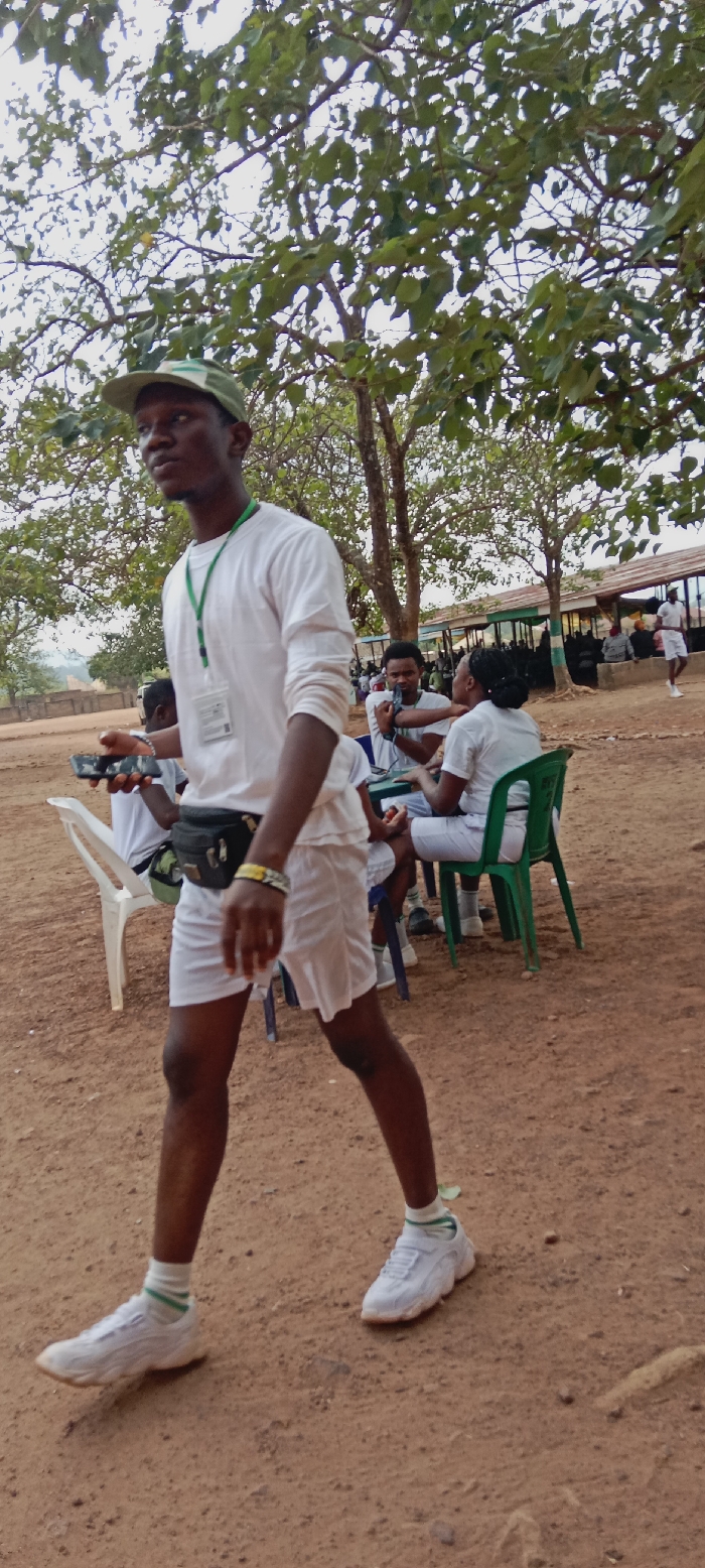 The scene depicts an outdoor gathering in Iyara, Nigeria, under a sky partially obscured by green-leafed trees. The ground is reddish-brown earth. In the foreground, a Black male, estimated to be in his twenties, walks from left to right. He wears a camouflage-patterned baseball cap, a white long-sleeved shirt with sleeves rolled up, white shorts, white socks with green stripes, and white athletic shoes. A green lanyard with a white identification card hangs around his neck, a black fanny pack is worn at his waist, and a yellow/multicolored bracelet is on his right wrist. He holds a black smartphone in his left hand and gazes towards the right of the frame. In the mid-ground, to the right of the main subject, several other individuals, also appearing to be Black and wearing white shirts and shorts, are seated around a small table. One male individual on the left side of this group is holding a dark object, possibly a microphone, to his chest. A female is seated beside him, partially obscured, and other figures are also present. They are seated on white and green plastic chairs. In the background, a long, low building with a green-trimmed roof is visible, under which additional people are seated. Another male, also in white attire, walks further back to the right. Distant hills, covered in vegetation, are visible on the far left horizon.