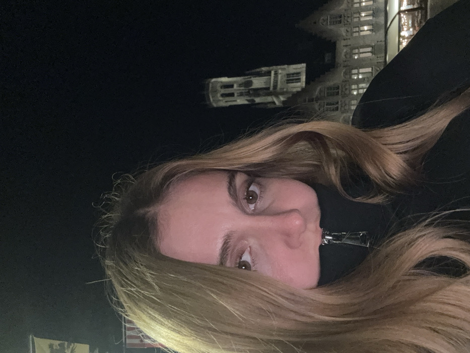 A close-up, chest-up nighttime photograph features a female individual with long, light brown hair and brown eyes. She wears a black garment with a visible silver zipper, zipped to cover her mouth and chin. Her eyes are directed forward. In the background, under a dark sky, the illuminated Belfry of Bruges, Belgium, is visible, partially obscured by the subject's head. To the right of the subject, a multi-story building with a gabled roof and illuminated windows is present, beneath which a section of an outdoor area with string lights is discernible. A partial flag with light-colored details against a dark background is located in the upper left of the frame.