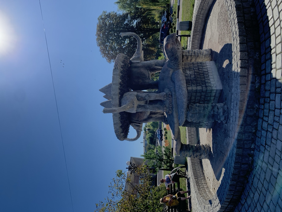 The image depicts a sunny, outdoor scene in a public park or square in Bohuslav, Ukraine. Dominating the foreground is a multi-tiered stone fountain or monument. Its base is a circular, cobblestone-lined basin. Above this, a large stone turtle sculpture forms the first tier, with the Cyrillic word "СЛАВКА" (SLAVKA) inscribed on its back. Resting on the turtle are four elephant sculptures with trunks raised, supporting a wide, circular, sombrero-like platform, which bears the inscription "СЛАВЬНА" (SLAVNA) or similar Cyrillic text. Several conical or pyramid-like shapes top this platform. To the left of the monument, two individuals are seated on a dark park bench. The person on the left wears a yellow top and sunglasses, while the person on the right wears a grey-white top. Both are seated facing towards the monument. Behind them are green bushes and a light-colored building with dark windows. To the right of the monument, mature trees with green and reddish-brown foliage are visible. In the background, a paved road can be seen with several parked dark-colored vehicles (sedans/SUVs). The sky is clear and bright blue, with the sun high, casting strong shadows from the monument and trees. A thin black utility wire spans the upper portion of the sky, and several small birds are visible in flight in the upper right quadrant. The foreground features additional cobblestone paving.