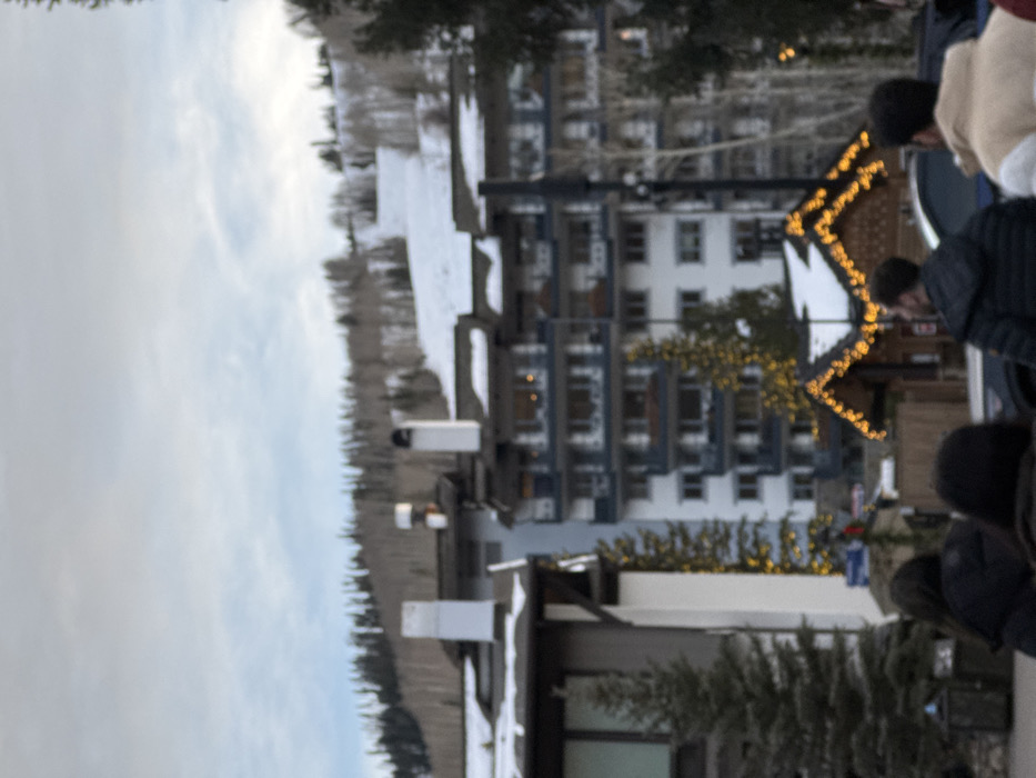 Buildings dominate the background with some snow on the rooftops and trees visible on the left. People stand on the right, some looking at buildings decorated with lights. The sky is cloudy.