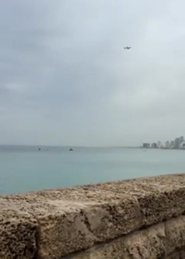 cityscape, a calm body of water with a few boats, a stone wall, and an airplane flying overhead. The sky is overcast. The buildings in the cityscape are mostly high-rise structures. The stone wall is made of light-colored, porous stones. The plane is small and white, getting smaller as it moves away from the camera.