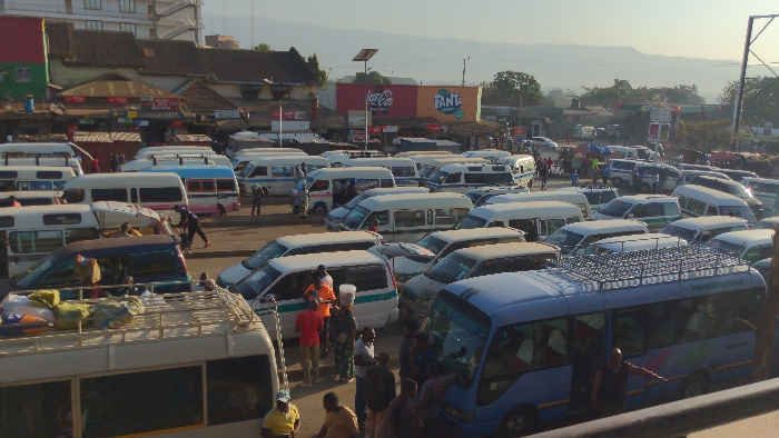 A bustling transportation hub displays a multitude of vehicles, predominantly vans, parked closely together. Many of the vehicles appear to be public transport. Groups of people stand around the vans, some seem to be passengers while others may be drivers or conductors. Buildings in the background are adorned with signs, including the well-known Coca-Cola and Fanta logos. Hills can be seen further in the distance, providing a backdrop to the busy scene.