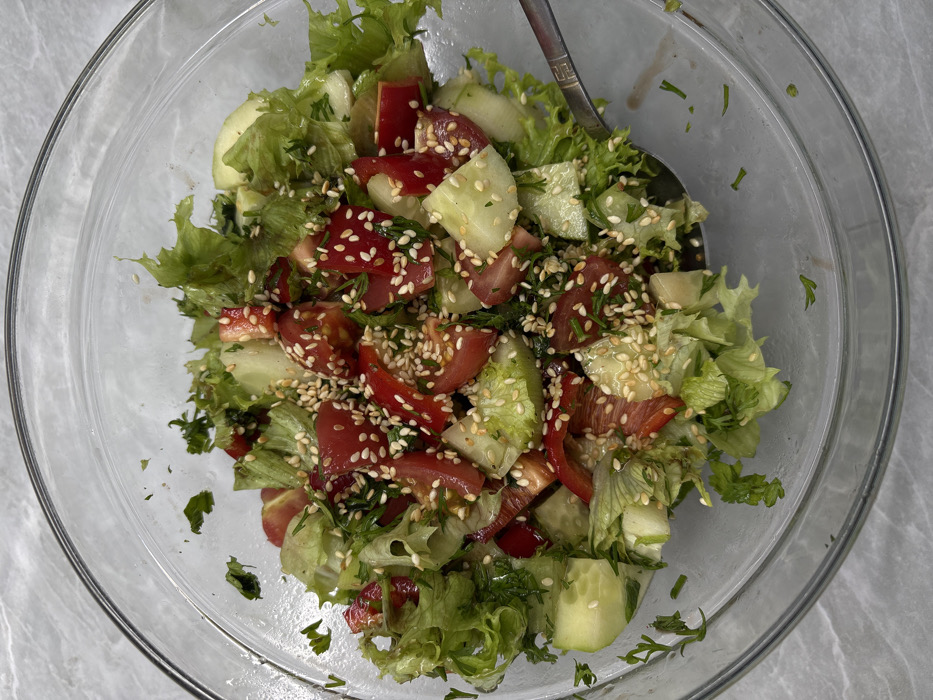 A clear, round glass bowl, viewed from a top-down perspective, contains a mixed salad. The salad comprises chopped green leaf lettuce, diced red tomatoes, sliced cucumbers, and pieces of red bell pepper. White sesame seeds are generously distributed over all ingredients and within the mixture. Small, chopped green herbs, consistent with dill or parsley, are interspersed throughout. A silver-colored spoon, featuring a subtle decorative pattern on its handle, is partially submerged in the salad along the right side of the bowl. The bowl rests on a light grey surface with a faint, irregular mottled or marbled texture. No individuals are present, and no architectural or contextual details are visible to determine a specific location within Tbilisi, Georgia, or any other city.