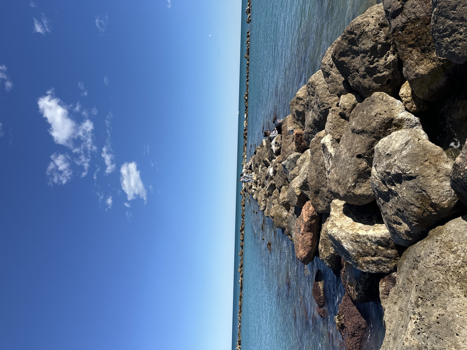 This image captures a coastal scene in Altea, Spain, under a clear, bright blue sky with scattered white cumulus clouds. A prominent breakwater, constructed from large, irregularly shaped grey-brown and reddish-brown boulders, extends from the foreground into the turquoise-blue sea, receding towards the horizon. The water on both sides of the breakwater appears calm. In the mid-ground, a group of three to four individuals is visible standing on the rocky structure. Closer to the right side of the breakwater, a single person is seated on the rocks, facing left. A faint, distant line of what appears to be another breakwater or rock formation is visible on the horizon, and a small white object, possibly a sailboat, is discernible in the far distance on the water's surface to the upper right.