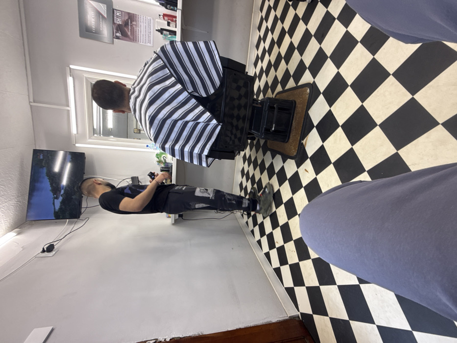 Inside a barber shop located in Gurkovo, Bulgaria, a male barber is attending to a male client. The room features light grey walls and a black and white checkerboard tile floor. On the left, a male with a beard, dressed in a black t-shirt and dark trousers with white graphic patterns, stands holding an electric hair clipper. He faces a male client seated in a black hydraulic barber chair, positioned with his back to the camera, covered by a black and white striped barber cape. A flat-screen television displaying a landscape scene is mounted high on the upper left wall. Below the television and extending to the right, a white shelf holds various barber products and a water bottle. A rectangular mirror is mounted on the wall above the right section of the shelf, next to a framed certificate. The image is captured from a low, seated perspective, revealing the observer's upper thighs clad in light blue/grey athletic wear in the foreground.