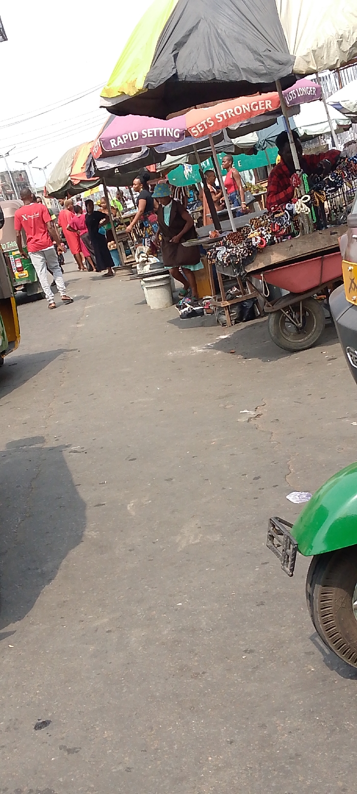 The image captures a bustling street market scene in the city of Agburu Uke, Nigeria