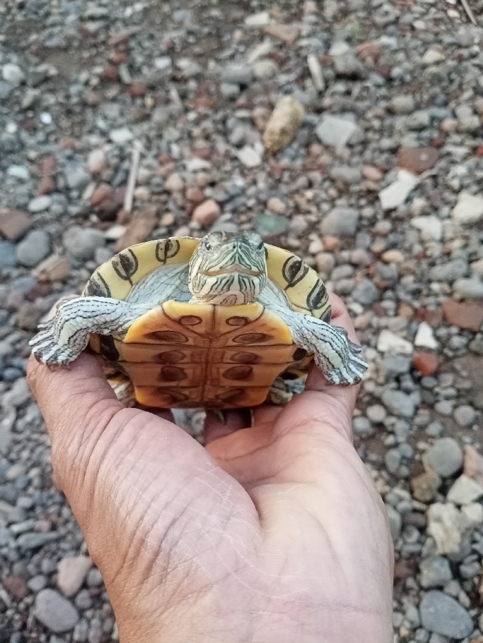 - "A red-eared slider turtle is held inverted in a human's left hand, its plastron facing upwards, against a blurred background of gravel and small rocks" by FM-cHJi83, licensed under CC BY 4.0