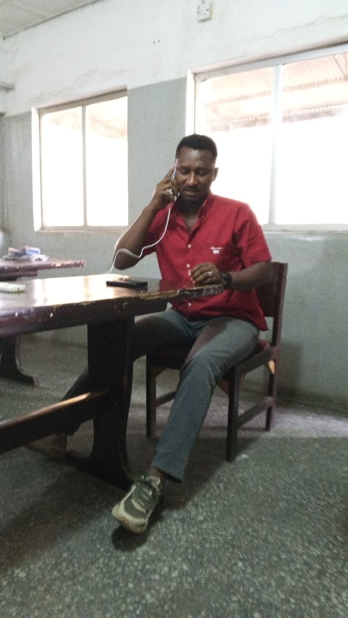 An adult male, with dark skin, short dark hair, and a beard, is seated on a dark wooden chair at a dark brown wooden table within an indoor facility in Dakata, Nigeria