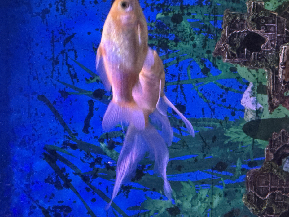 This image depicts an indoor aquarium environment, located in Netanya, Israel. The central subject is a light orange-colored goldfish, identified by its prominent eyes, slightly distended body, and elongated, translucent flowing fins. It is oriented horizontally, facing right. Directly below and slightly behind the primary goldfish, a second, smaller goldfish of similar coloration is partially visible. The background consists of a vibrant blue panel, textured with irregular dark green and black shapes resembling stylized aquatic vegetation or algae. In the lower foreground, two artificial sunken wreck or ruin-themed aquarium decorations are present. The left decoration is partially obscured, appearing as a dark, textured structure. The right decoration is more fully visible, presenting as a dark brown-grey sunken vessel or ruin with an open cavity and simulated green moss-like growth on its surface. The entire scene is submerged in water and adequately illuminated.