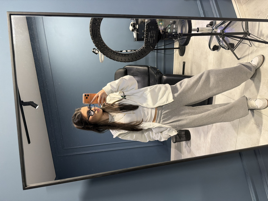 The scene depicts a female subject, estimated to be a young adult, standing in a room in Yerevan, Armenia, capturing her reflection in a full-length mirror using an orange-cased smartphone held in her right hand. The subject is dressed in a white ribbed crop top, a white zippered jacket, grey wide-leg sweatpants, and light-colored sneakers. She wears dark-rimmed glasses with blue-tinted lenses and multiple gold-colored necklaces. Her dark hair is styled in a half-up ponytail. The reflected environment features dark teal walls with decorative paneling and a light-colored floor. Key objects within the room include a black reclining chair positioned behind the subject, a large black circular LED ring light mounted on a tripod stand located to the right, and a black mesh waste bin situated to the left. A black ceiling track light with two spotlights illuminates the space. A small skull-shaped decorative object is partially visible on a surface behind the ring light.