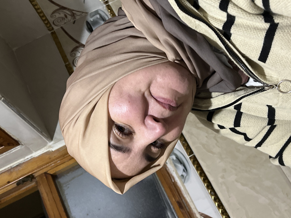 A person wearing a light brown hijab is centered in the image, face angled towards the viewer