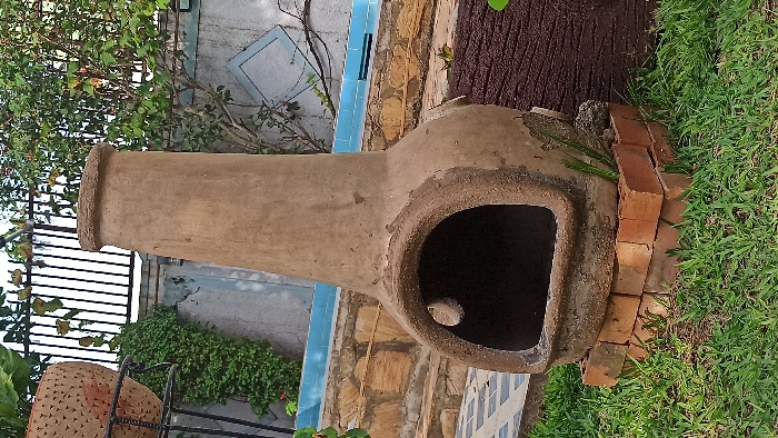 - "A weathered, light brown earthenware chimenea is centrally positioned on a base of red bricks, surrounded by green grass, in an outdoor setting within Kigali City, Rwanda" by FM-oIWu62, licensed under CC BY 4.0