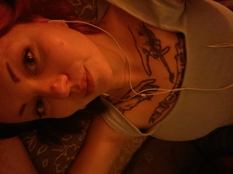 A woman with reddish hair and fair skin gazes at the camera, lying down. White earphones are visible around her neck and ear. She wears a light-colored shirt. A large, detailed tattoo decorates her chest, featuring hands and a skeleton-like figure within a curved design. The background includes a patterned fabric, possibly a blanket or pillow. The overall lighting is warm, casting a soft glow on the scene.