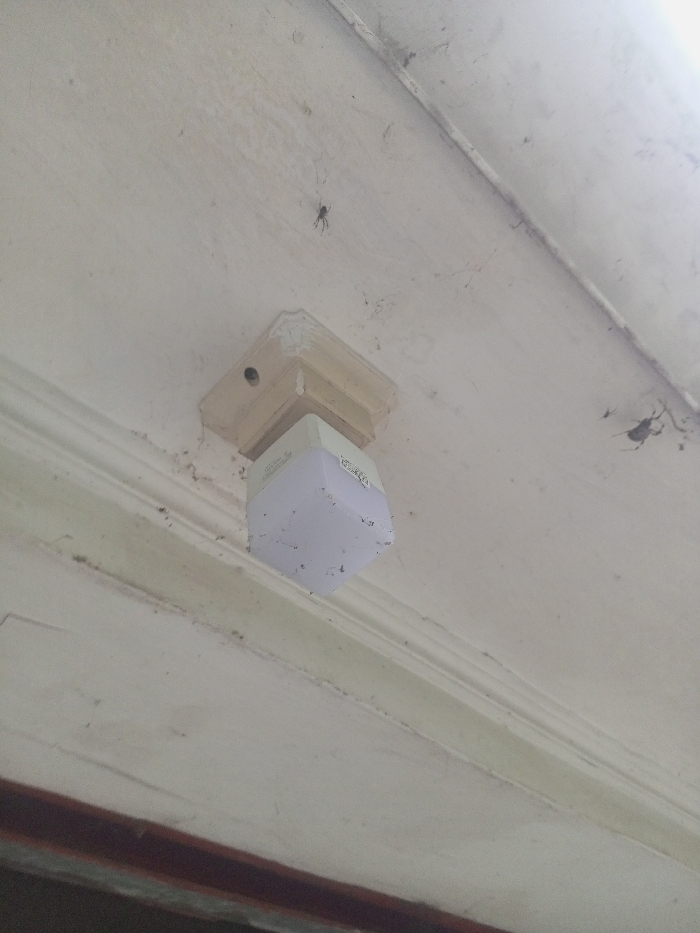 The image displays an upward-angled view of an off-white ceiling or overhead structure located in Zee Pin Kone, Myanmar. The surface exhibits accumulated dust, grime, and fine cobwebs, particularly along seams and edges. A square, translucent LED light fixture is mounted centrally on the ceiling. This fixture is attached via a beige, square base block and is itself covered in dust and small particulate debris. A partial product label is discernible on the right side of the light fixture's housing. Three distinct spiders are visible on the ceiling. One dark-bodied spider is positioned on the flat ceiling surface, above and slightly to the left of the light fixture. A second, larger dark-bodied spider is located in the upper right quadrant of the frame, adjacent to a ceiling seam. A smaller arachnid or insect is present below and slightly to the left of the second spider. Fine strands of cobwebs are distributed across various sections of the ceiling, concentrated around the spiders and structural interfaces. An off-white decorative molding runs horizontally across the mid-ground of the image, below the light fixture. This molding also shows signs of dirt accumulation. A darker, indistinct horizontal band is visible at the bottom edge of the frame, indicating a structural boundary. The scene is illuminated by an unseen, diffuse light source.