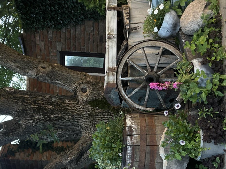 This image depicts a rustic outdoor decorative arrangement located within Мірскі сельскі Савет, Belarus. The scene is dominated by a large, gnarled tree with textured, dark bark and multiple exposed roots, positioned on the left and extending upwards. Behind the tree and to its right stands a reddish-brown brick wall, part of which is covered with dark green ivy on the far right. A narrow, dark-framed vertical window is visible in the brick wall to the right of the tree, reflecting a light-colored outdoor scene. In the midground, a weathered, half-barrel planter with distressed white paint on its rim and metal bands contains dense green foliage and small white flowers. Adjacent to this barrel on the right is a large, greyish-brown wooden wagon wheel with visible spokes and a central hub, leaning against or integrated into a larger, distressed wooden structure. This structure, possibly a cart or chest, exhibits white paint, rusted metal hardware, and a draped light-colored fabric or canvas with a coiled rope. The foreground features an assortment of potted plants and natural elements. A grey, faceted pot on the lower-left contains vibrant green foliage and several small white flowers with purple centers. To its right, a silver-toned, textured pot holds green plants and a tall stalk of bright pink flowers. Further right, another light grey, textured pot displays white and yellow daisy-like flowers. Dark, reddish-brown ground cover is interspersed between the containers. Several irregularly shaped, light grey rocks are positioned among the plants, contributing to the natural, aged aesthetic of the display. No individuals are present in the image.