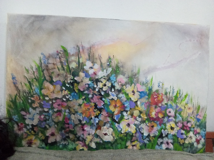 A canvas painting depicts a vibrant, colorful meadow