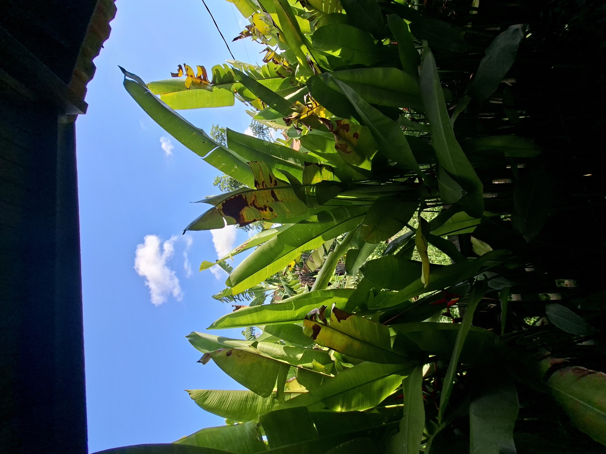 The image is an upward view of lush vegetation and the sky, taken in Lodtunduh, Indonesia. Large green leaves, some with brown spots, fill much of the frame, angled upwards toward a blue sky with scattered white clouds. A portion of a dark, possibly wooden, structure is visible at the far left edge of the frame. The lighting suggests a sunny day, with shadows playing across the leaves. The scene appears to be a close-up view of the vegetation, possibly from underneath the foliage.