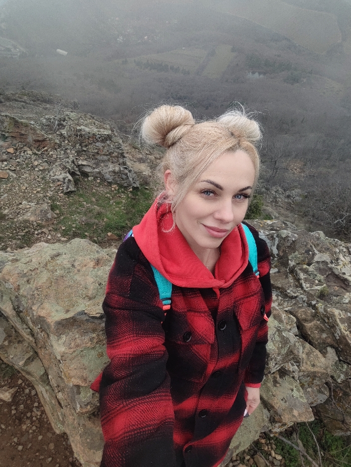 A blonde woman with her hair in two buns poses for a selfie. She wears a red hoodie and a red and black plaid jacket with teal backpack straps. The background is a foggy mountain landscape with rocky terrain. The woman stands on a large rock, blending with the overall rugged environment.