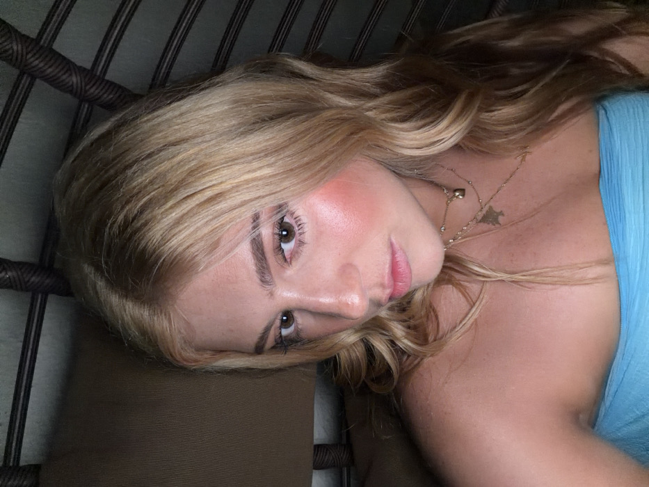 A young woman with blonde hair is lying down, looking at the camera. She has fair skin, brown eyes, and pink lips. Her hair is styled with loose waves. She is wearing a light blue top. A gold necklace with a star charm is visible on her neck. The background consists of a pillow and what appears to be the back of a chair with striped patterns. The photo is taken at a slightly tilted angle.
