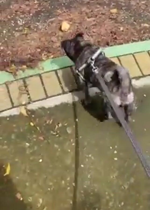 A medium sized dog with a brindle coat is on a leash and being walked on a paved surface with some standing water