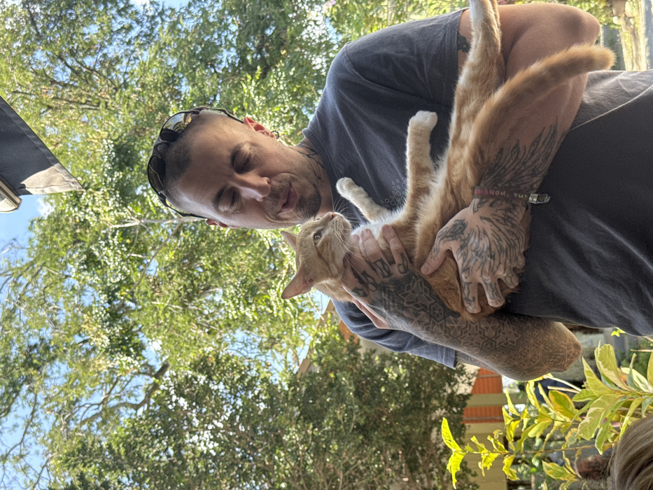 A man with a shaved head and extensive arm tattoos is holding an orange cat. The cat is looking up at the man. The man is looking down at the cat. The scene is outdoors, with green foliage visible in the background. The angle is slightly tilted, and the lighting is bright, casting some shadows. The man is wearing sunglasses on his head and a grey t-shirt.