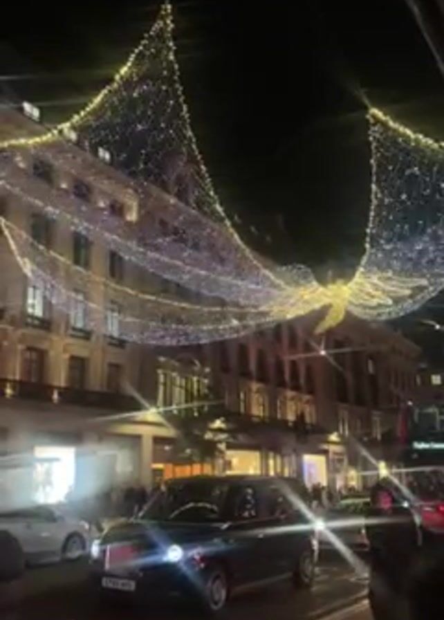 The scene is a nighttime street view in a city decorated with festive lights. Buildings line the street, and strings of lights resembling nets or wings are suspended overhead. A black taxi drives on the street, and other cars and a red double-decker bus can be seen in the background. Several pedestrians are walking on the sidewalk. The overall atmosphere suggests a lively, urban setting during a holiday season.