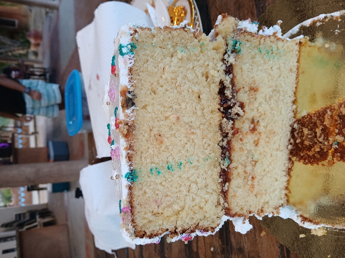 - "The image depicts a vertically cut, two-layer vanilla cake, prominently displayed on a golden cake board in an outdoor or semi-outdoor setting within Guayacancito, Venezuela" by FM-Orjiq1, licensed under CC BY 4.0