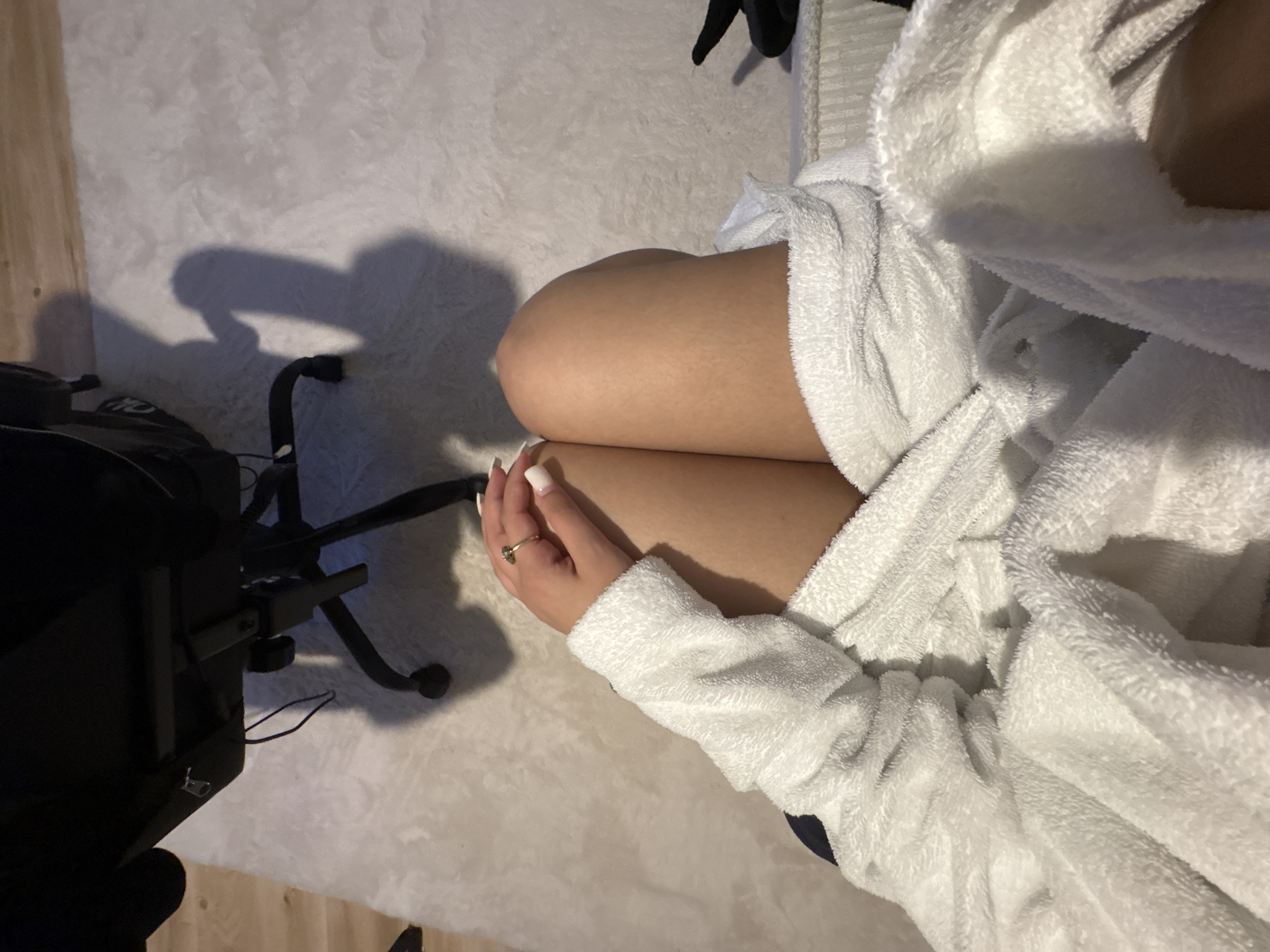 The image presents a high-angle view of a seated individual within an indoor environment in Mönchengladbach, Germany. The subject's bare legs are visible from the upper thighs downwards, partially draped by a white, terrycloth bathrobe. The person's left hand, featuring white-tipped fingernails and a gold-colored ring with a dark gemstone on the ring finger, rests on the left thigh. In the background, the lower portion of a dark office chair, including its wheeled base and frame, is visible on a light-colored, shaggy rug. A dark cable hangs from the chair's underside. A section of light-toned wooden flooring is present along the left edge of the rug. Shadows consistent with the chair and a human figure are cast upon the rug.