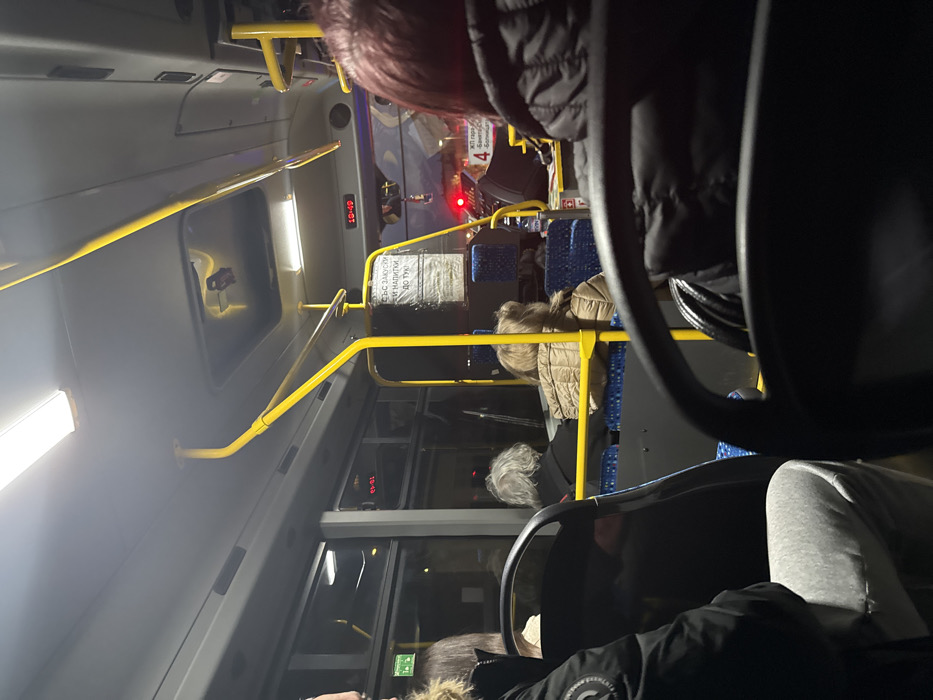 - "The image depicts the interior of a public transit bus at night, captured from a seated passenger's perspective looking towards the front" by FM-2nJO52, licensed under CC BY 4.0