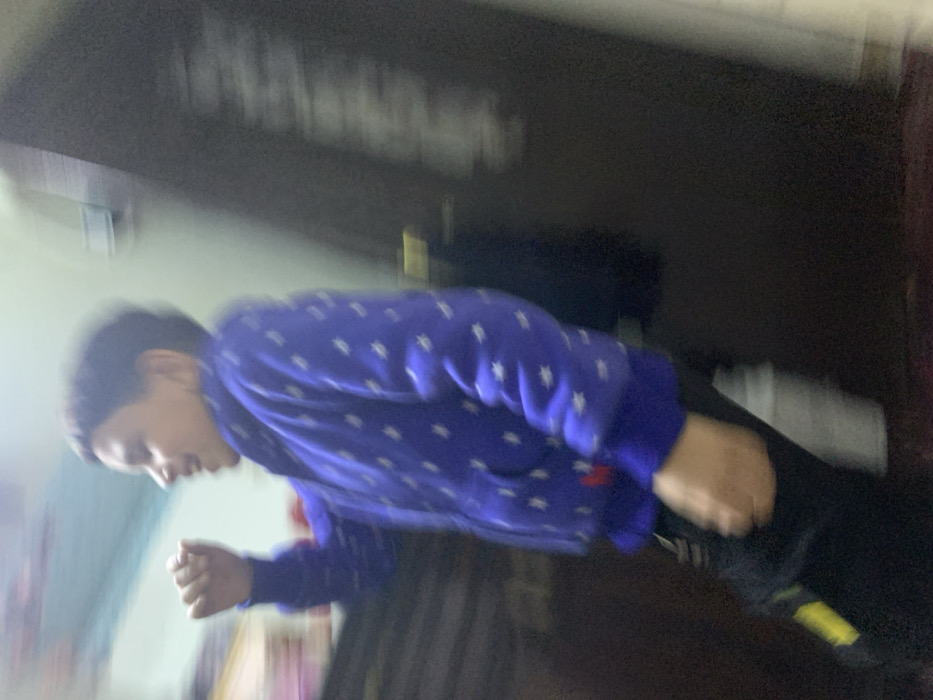 A person wearing a blue jacket with white stars and black pants is captured in a motion-blurred image. Their face is partially visible, with a lowered head and a focused gaze. One hand is clenched, as if punching, while the other is outstretched. The background includes a dark wall, what seems to be a television, and elements of furniture. The overall image quality is poor, obscuring details.