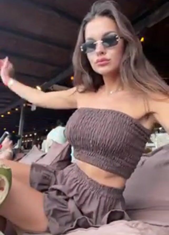 A woman is seated on a cushioned bench, wearing a brown strapless crop top and a matching brown skirt. She is also wearing rectangular sunglasses. She has long brown hair and a delicate necklace. She is sitting under a wooden structure with lights visible. She smiles, waves, and adjusts her sunglasses. A coconut with a straw sits next to her. Other people and tables are visible in the background.