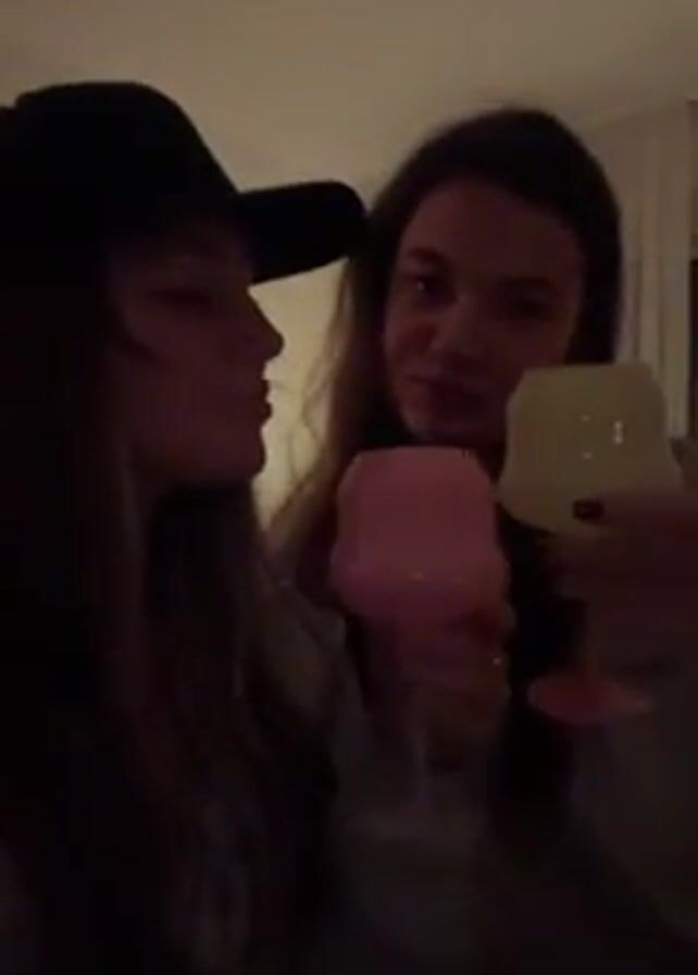 Two women are raising and clinking colorful wine glasses toward the camera in a dimly lit room. One woman wears a black hat. The glasses are pink and yellow. The camera then moves extremely close to the pink glass, causing the image to become completely pink.