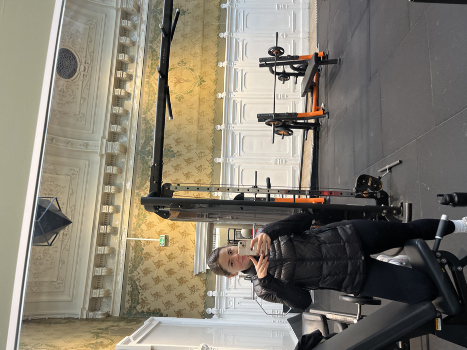The scene depicts a female individual taking a mirror selfie inside a gym located in a historical building in Roubaix, France, specifically the Wellness Sport Club Roubaix (formerly the Hôtel de la Chambre de Commerce et d'Industrie)