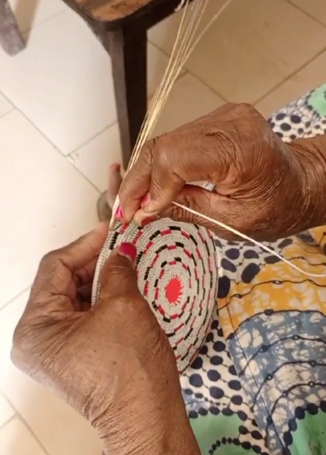 A close-up, overhead shot shows an individual's hands engaged in a craft. The person is seated, wearing a colorful patterned garment in shades of blue, green, yellow, and white. A light green wristband with the inscription "JESUS 16" is visible on their left wrist. The hands are actively weaving a coiled basket, which is primarily comprised of alternating concentric rings of gray and black beads, with a red center. The individual is using thin, light-colored plant fibers to sew the coils together, creating the form of the basket. A small wooden table with a patterned top is partially visible in the upper left corner of the frame. The background consists of light-colored flooring. The scene focuses on the intricate handwork and the colorful material being crafted.